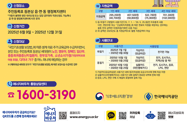 에너지바우처는 취약계층이 겨울철 난방비나 여름철 냉방비 부담을 덜 수 있도록 전기, 도시가스, 지역난방, 등유, 연탄, LPG 등의 에너지 구매를 지원하는 정책입니다. 실물카드 또는 요금 차감 방식으로 제공되며, 수급자의 라이프스타일에 맞춰 자유롭게 선택할 수 있습니다.